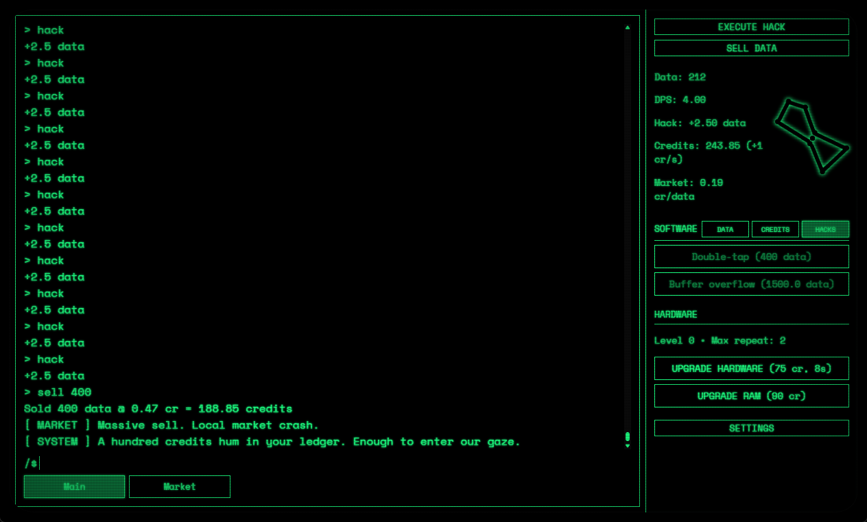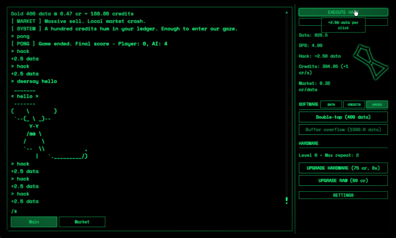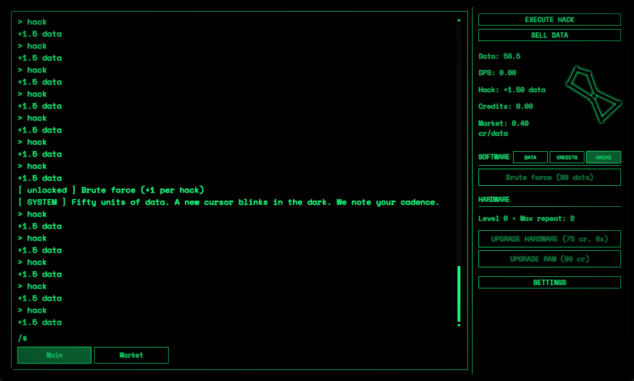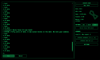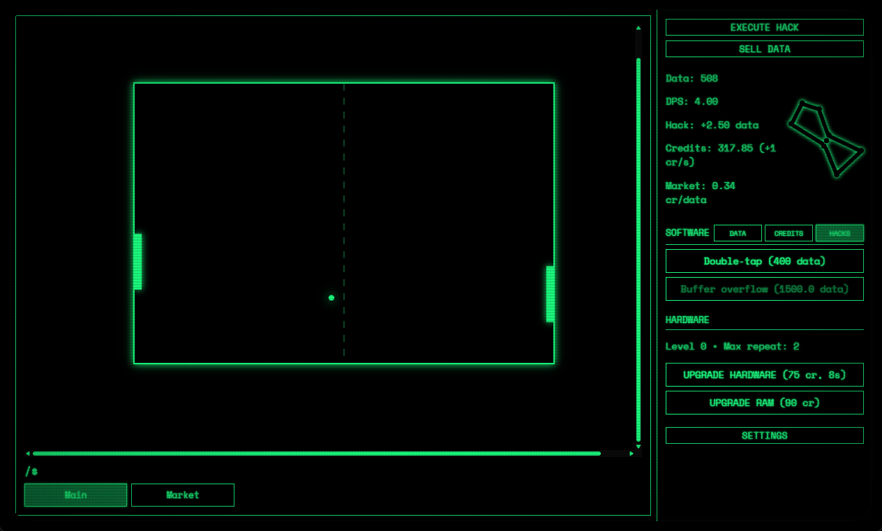 A clicker idle game themed around hacking. This is the bones plus a little extra added features to keep me sane and wanting to keep working on this. The story will be expanded later and the software/hardware upgrades I want to do a full pass over still but for now this works.
